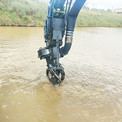 Watermaster can also suction dredge. Because its submersible pump is integrated with the cutter head under water the slurry enters the pump immediately, giving higher solids concentration and lower turbidity compared to conventional pumps on deck.