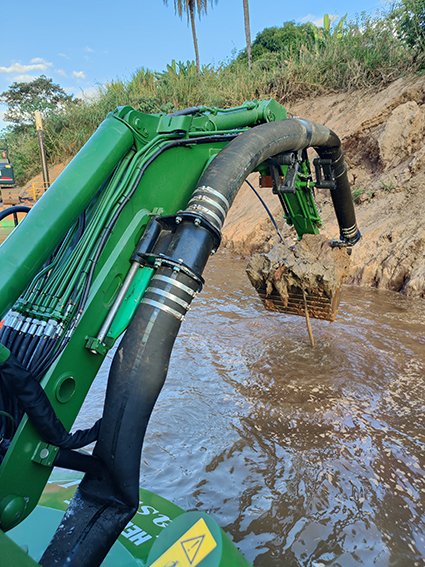Watermaster’s first task is to open the shallow stretches of river sediment that block access to the tailings. With its bucket, it clears these bars and creates the draft needed for the CSD and the excavators on barges to work. It also helps maintain the CSD’s discharge pipeline. If large rocks are in the way, Watermaster breaks them with its hydraulic hammer to keep the way open for the larger units.